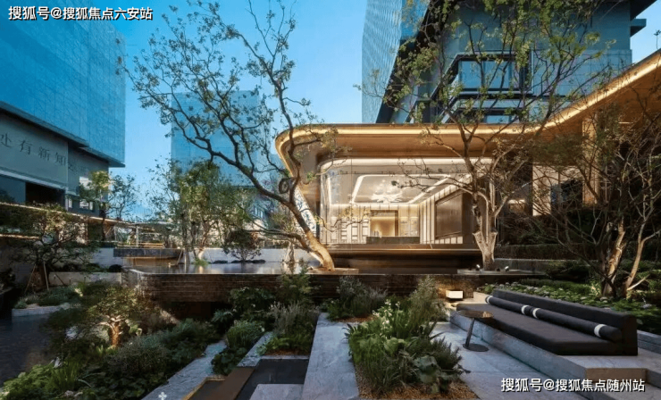 绿城·知海棠充分利用抬地。一方面做出立体森林景观,叠山理水,水波款款,枝繁叶茂间,浮岛游弋;另一方面,各类动线相互穿插,拾级而上,如同丝带般延展,“未来版西湖十景”渐次展开,无界泳池、下沉庭院、星光水院、疗愈花园等生活场域,人随景动。