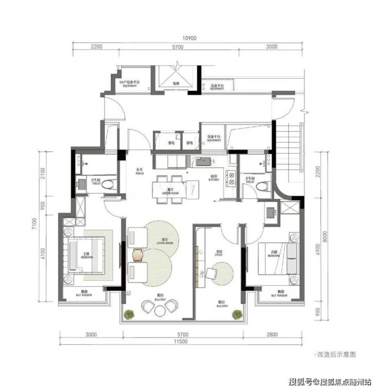 当然,预算更高的可以看看——刚改旗舰边套户型:建面约114方四房两卫。