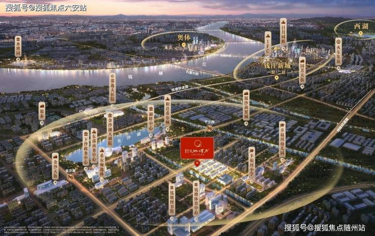坐落钱塘区学林街与幸福南路交汇处(地铁1号线下沙西站),毗邻钱江新城,坐拥金沙湖“杭州小三亚”湖景资源,直线距离仅500米🌊。