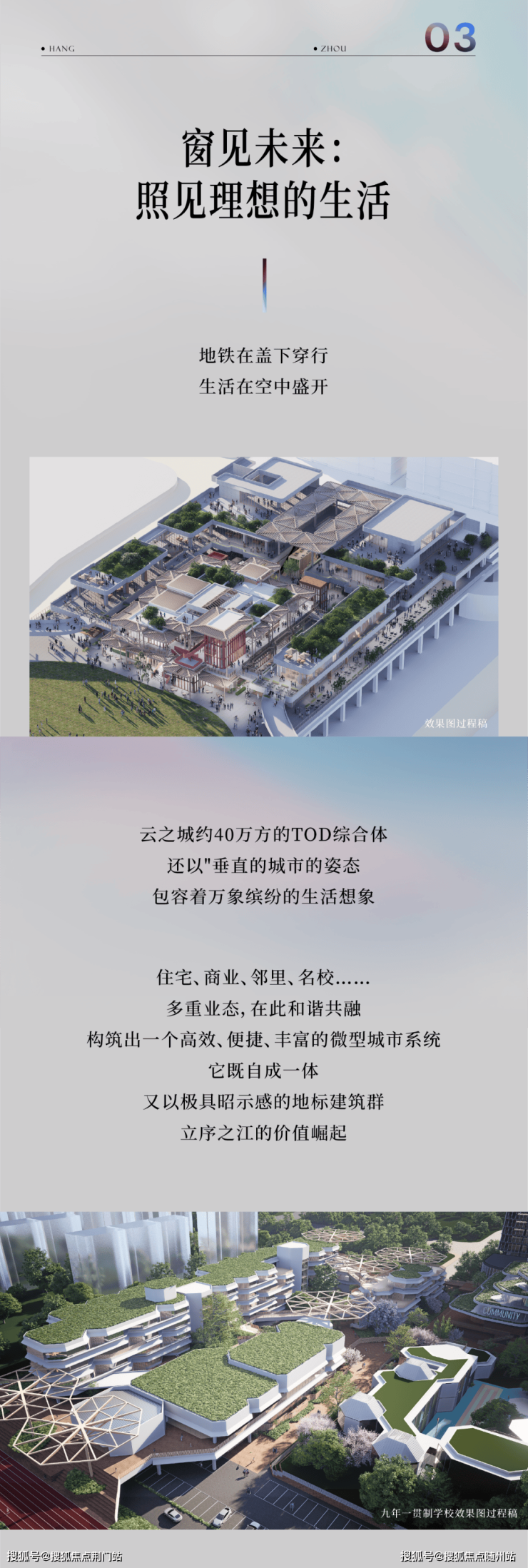 而云之城,正是这一蓝图中的“皇冠明珠”。作为之江科创城核心区的首发巨作,项目以约40万方TOD综合体体量,聚合住宅、商业、公园、学校等多元业态,重新定义“站城人一体”的TOD都市范式。