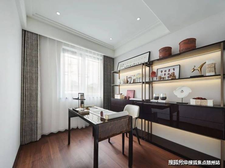 主卧一旁的多功能房设置书房,营造出书香门第的文化氛围。人在其中才不会心浮气躁。传统中式书房从陈列到规划,从色调到材质,