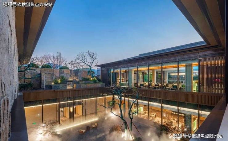 穿过景墙是下沉水院,连着售楼大厅和松林剧场,一边是水瀑潺潺,流淌成一幅古雅的宋韵山水画卷,一边是肆意舒展的罗汉松、老红梅、羽毛枫,铺展出悠远的东方意境。