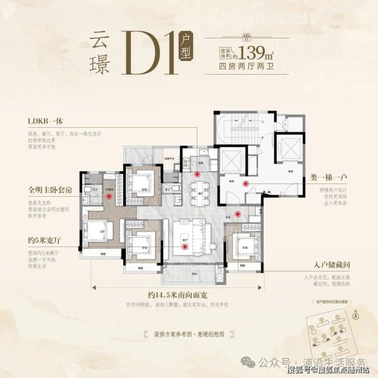 1、四大开间 面面朝南(南向面宽约14.5米)