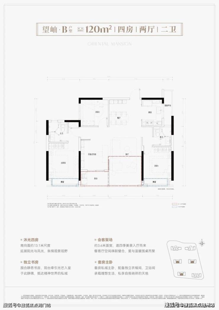 建面约120方户型:这款户型设计非常不错,在这个120方的面积段里不仅做了四房设计,而且还是四开间朝南,南向采光非常好。