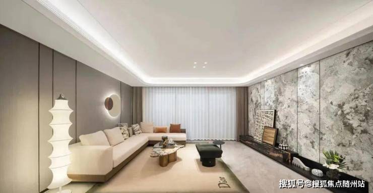 室内做了“双背景墙”:主卧是皮革硬包,客厅是奢石风岩板背景墙,还做了多层弧形工艺吊顶。搭配约3.1米层高,一进门就很有大宅氛围感。
