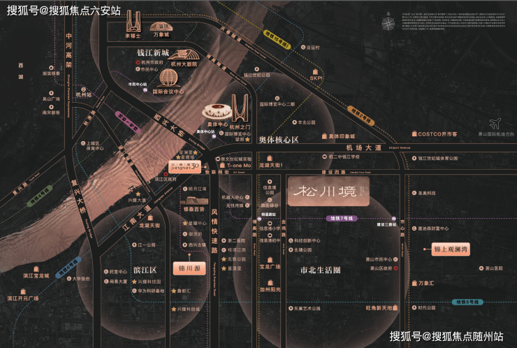 项目坐落于杭州奥体板块的黄金十字轴心——金鸡路与建设四路交汇处以东约150米,直距奥体地标“杭州之门”约3公里。作为滨江和兴耀两大杭州本土房企的第三次合作作品,松川境融合了滨江集团的豪宅基因与兴耀房产的独立美学理念,打造出奥体板块难得的低密墅境住区。