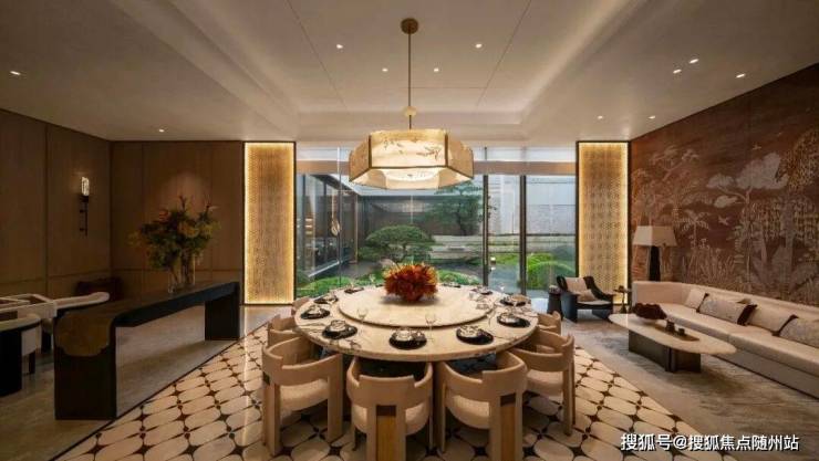 下沉式庭院作为整个会所的灵魂所在,以约7米高溪山流瀑、5棵造型黑松,重现《溪山行旅图》意境。园区内还巧妙融入约1500㎡的下沉式会所,使功能空间与自然环境完美融合。