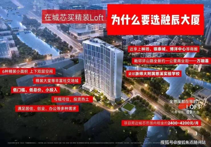慈溪城芯融辰大厦:4.45米层高网红公寓,38-73㎡毛坯精装,近万融荟商业街,轻资产创业生活主场
