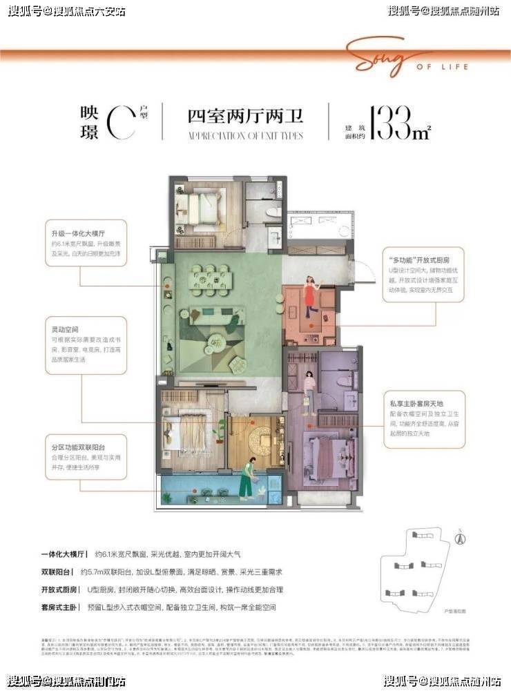 户型亮点:主力建面约106-133㎡三至四房,106㎡三开间朝南+双联阳台,U型厨房+独立玄关,小面积实现功能最大化;130-133㎡四房两卫,横厅设计+餐客厅一体化,主卧套房预留衣帽间,北向双卧方正实用,满足二胎家庭或三代同堂需求。