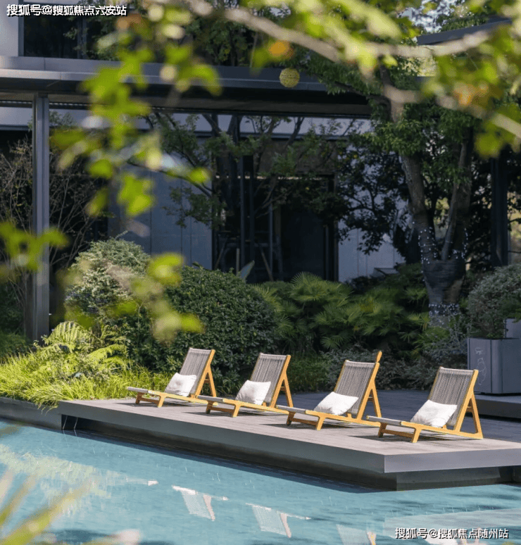 活力剧场里设计了湛蓝的景观戏水池,水岸布置茶几休闲躺椅、还种上了一大一小两株樱花树,度假感直接拉满。
