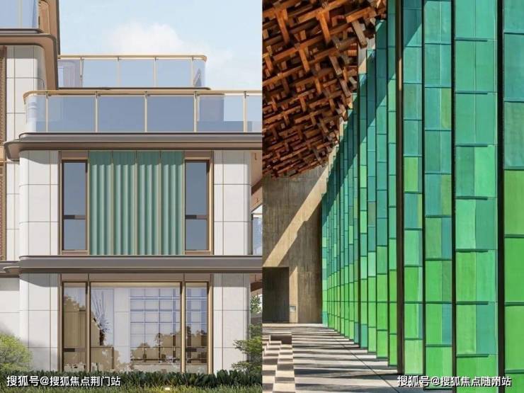 建筑设计采用现代东方风格融合宋韵美学与现代摩登手法,色彩搭配上,延续东方建筑的典雅质朴,以温暖色调与自然木色为主调,青绿色陶板作为点缀,提升色彩饱和度,尽显东方美学韵味。
