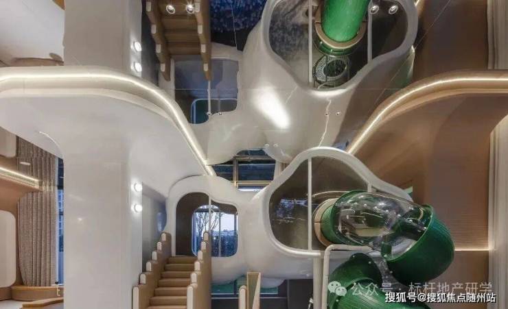 在首层架空泛会所场域,打破室内外空间的相互渗透,引入丰沛而多元的场景联想:不仅与喜马拉雅联名,打造了湖西首座可以借阅的「第二图书馆」和可以自习进修的「静坐学堂」,还以一米儿童视角,带来了苏州首个全封闭式的「发小乐园」,让每个人,在家楼下就能享受到最珍贵的日常。