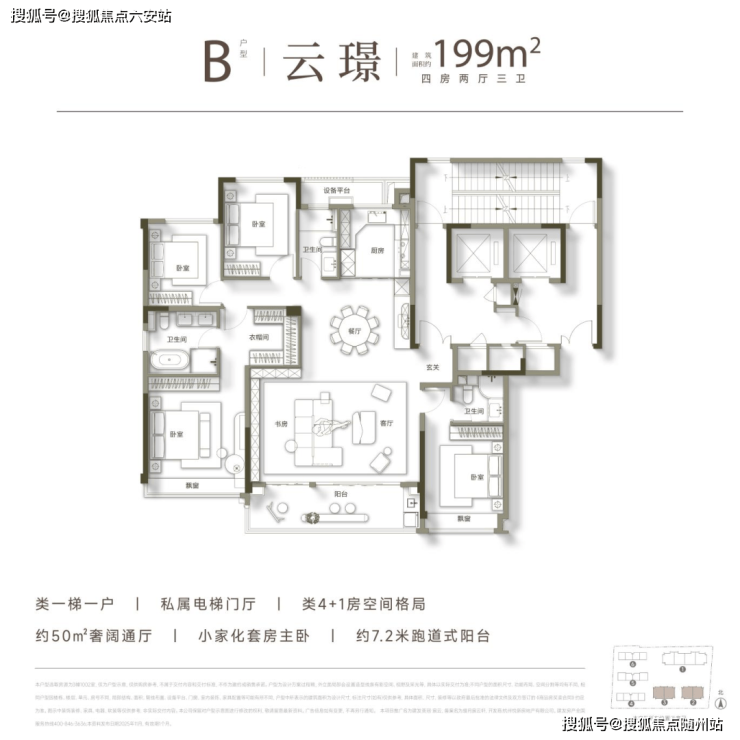 项目涵盖建面约199㎡观云奢宅&建面约371-452㎡中式排屋。高层类一梯一户,专属电梯前厅;采用洄游式通厅设计,LDKB一体化连通,跑道式双联阳台,主次卧均设计为套房。
