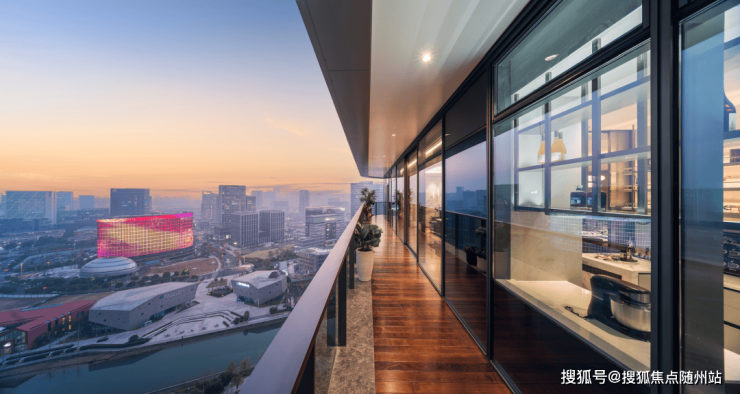 浙江中南控股集团以“幕墙”为拳头产品,在自家作品上动用了“黑科技”,巨型画幅玻璃被做成了移门,可以面向城市景观一键开合。