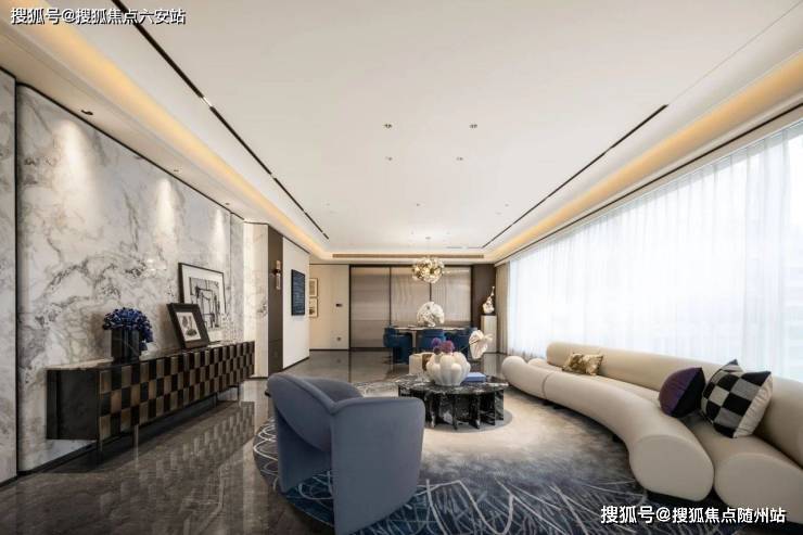 客厅:19米超大面宽搭配270°环绕视野,钱塘江柔美曲线融入弧形吊顶与奢石拼花;