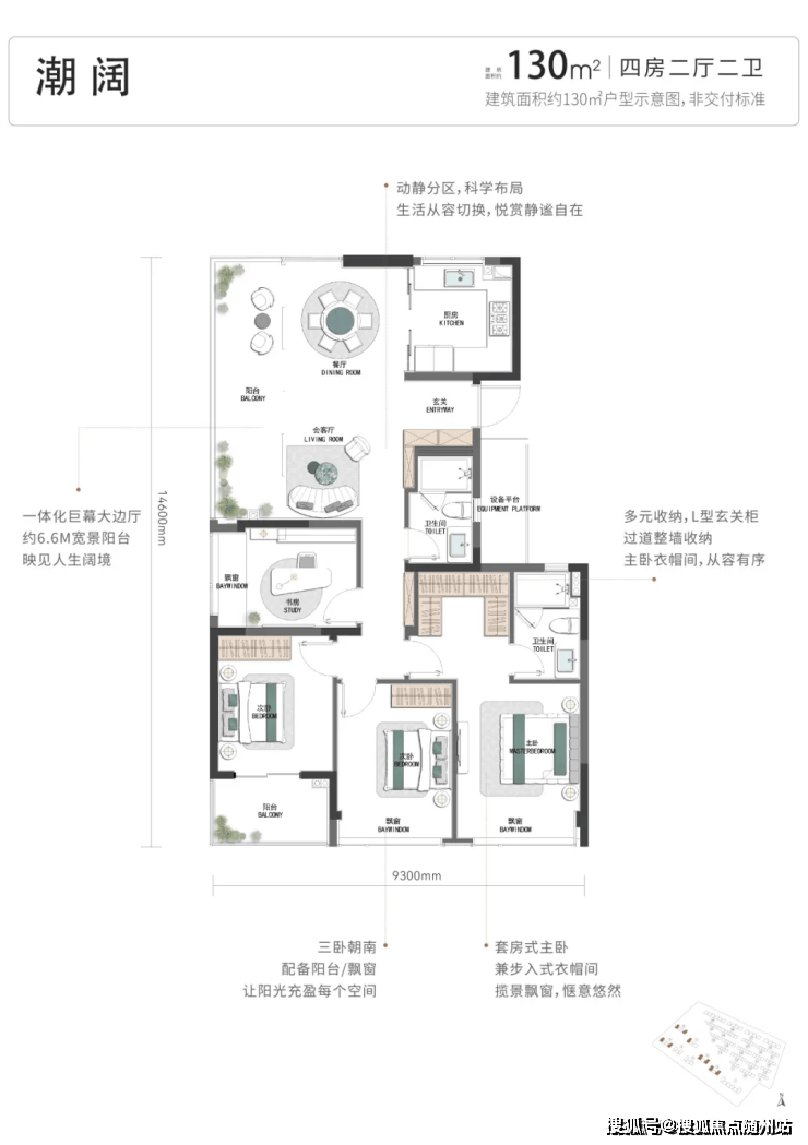 一般来说,3房户型都只能做三开间朝南,但是潮映杭园设计了一个 约12.6米四开间朝南的户型,不要小看这多出来的一个开间,它能让家里每一位业主都能享受到充足的阳光。