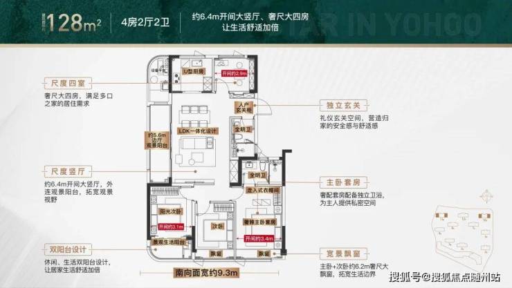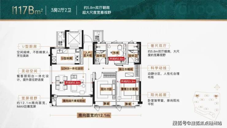 约5.8m双厅朝南,大尺度的宽幕视野;动静分区,人性化合理布局