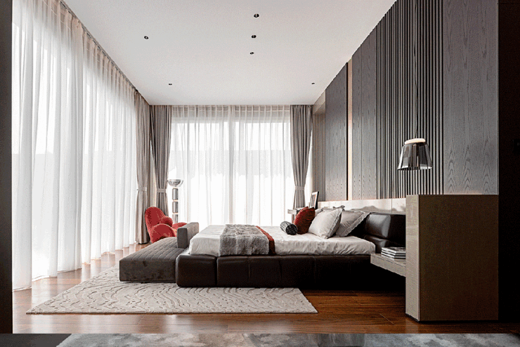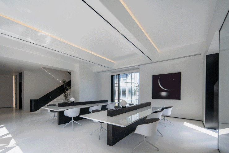 各层空间根据使用层级进行垂直分配:地下一层为挑高6.6米的会所展厅,可满足接待、展示、休闲等复合需求;地面一层设有接待门厅与会议空间;二至三层作为企业办公区,高管与员工办公空间可相对独立;最上层则为企业主自用的生活起居区,真正实现“上居下办”,让工作与生活自然过渡。