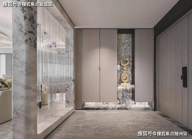 户型格局上,基本做成了类一梯一户格局,一层两户两部电梯,彼此都拥有独立的入户门厅。进门是大空间玄关区,与之搭配的辅料,有皮革、山水纹理大理石、瓦楞玻璃、仿古铜金属等,时而明澈,时而苍劲。米白色石材和温润的木质面犹如一个盛载东方意蕴的艺术品。