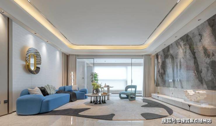 客厅选用芬迪白奢石作为背景墙,搭配金属框线,加强空间价值感。