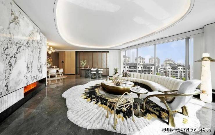 潮博385m²的钻石厅,是去年的产品,沿用了梅西家同款的FENDI白大理石做了一道圆弧形背景墙,转角是工艺复杂的波浪纹,不仅造型独特,而且损耗极高,配合火红的壁炉、米白的钢琴键沙发,别致的水滴形吊顶与弧形PRADA绿奢石岛台交相呼应,升华了艺术氛围。