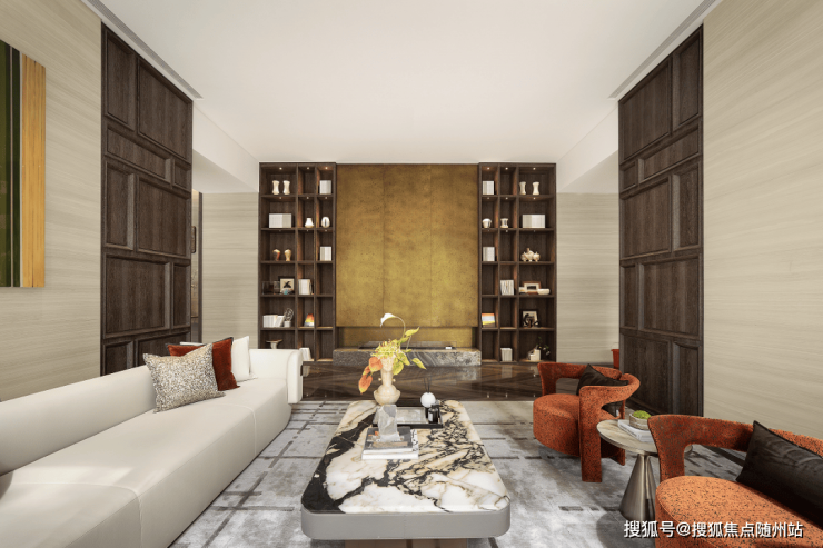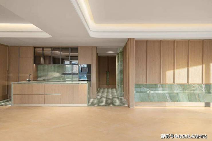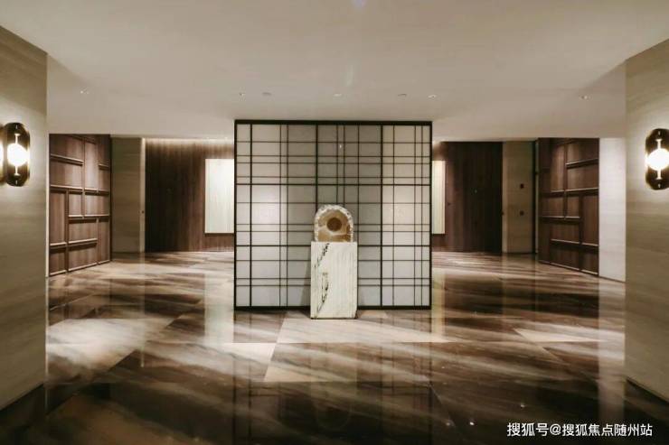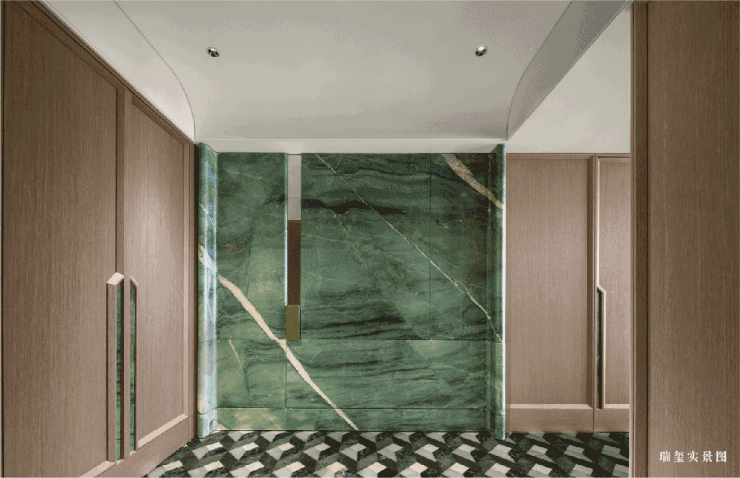细节处,奢石与影木交相辉映,以水刀拼花工艺铺就艺术长廊,从电梯厅延伸至室内;大师美学灵感的奢雅渗透生活每一处肌理。