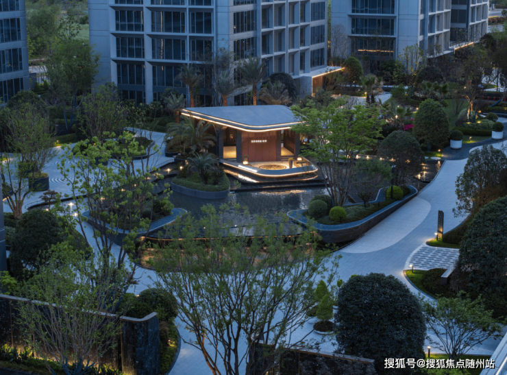 一座游艇式廊亭斜插进中央水系。廊亭四周,银海枣、铁冬青和娜塔栎等名贵树种交错,营造出度假感极强的亚热带景观。