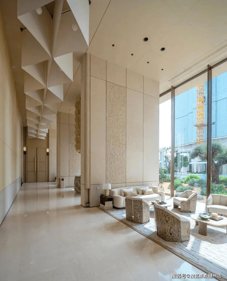 作为首个度假风情的住区,璟逸汲取希腊安缦酒店与Gundari度假村的精髓。素雅的米白石壁墙引领访客,穿行于水院与连廊之间,步入白色莱姆石建筑群,冰蓝水面与沙生植物交织的闲适景致,仿佛将圣托里尼的暖阳拥入怀中。入口处显眼的“矮大紧”树种,介绍说是有上千年树龄的油橄榄,这类树种单棵价格起码有250万,相当的豪气。