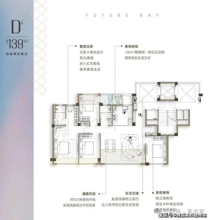 约139方户型, 4.5开间朝南+储藏间,南向15.9米超大采光面,做到五开间朝南的空间,标配储藏间,三个南向卧室设计。