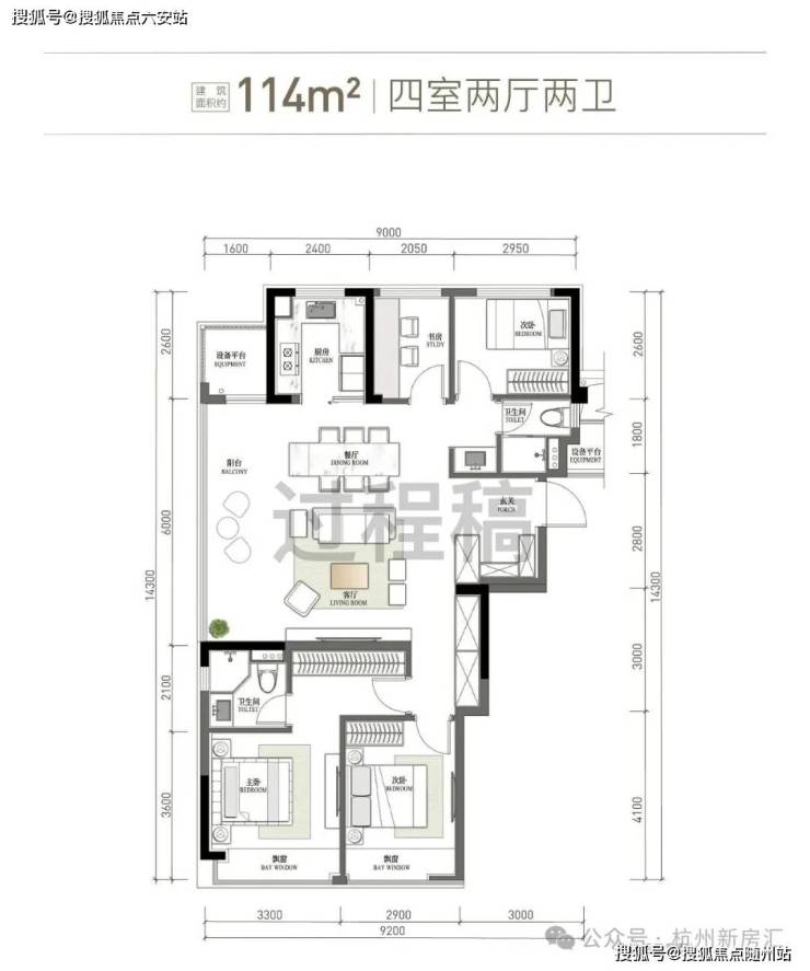 刚改旗舰边套户型:建面约114方四房两卫。