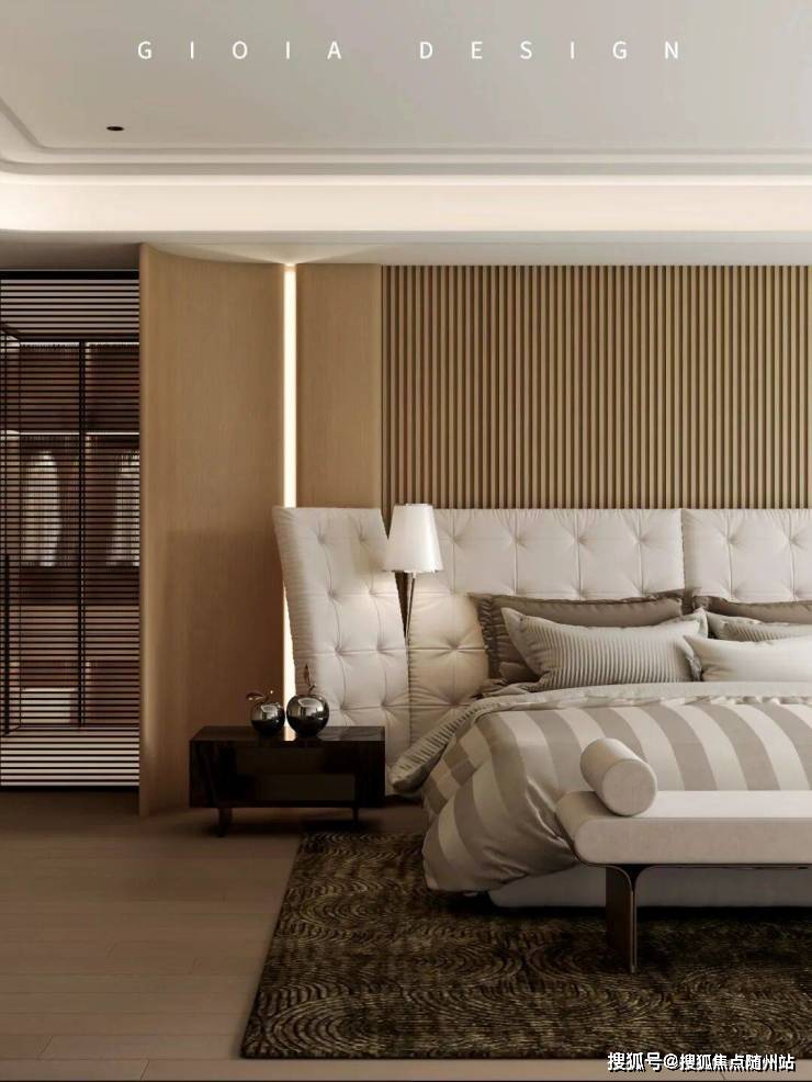 主卧中,Visionnaire Ripley 床架以低调奢华诠释休憩美学。深灰色真皮面料带着荔枝纹肌理,床头绗缝工艺暗藏对称美学,金属嵌条如精致腰带勾勒轮廓,与硬装艺术玻璃形成呼应。两侧悬浮床头柜轻盈悬空,玻璃台面与金属支架透着现代气息,柔和灯光洒在床品上,营造静谧安稳的睡眠氛围。