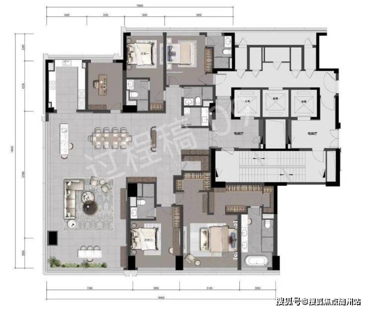 公区方厅第一眼的感觉就是辽阔,建筑面积超90㎡,想举办超大型party都没问题,并且南向开间有约19米,这样的尺度能和市面上四五百方户型的客厅媲美了。