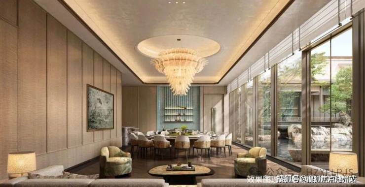 设置全域风雨连廊,园林景观独具匠心,将西湖十景融入园区,53米宽、10.85米高的中式大门搭配罗汉松与黄铜狮,尽显归家礼仪;中庭复刻“柳浪闻莺”“花港观鱼”,如西湖画卷;下沉庭院有百年古树,步移景异如“人在画中游”。
