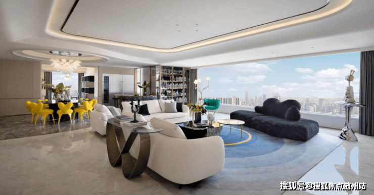 在售建面约303-412㎡大平层,5房以上布局,部分边套设计6.8米挑高观景台。