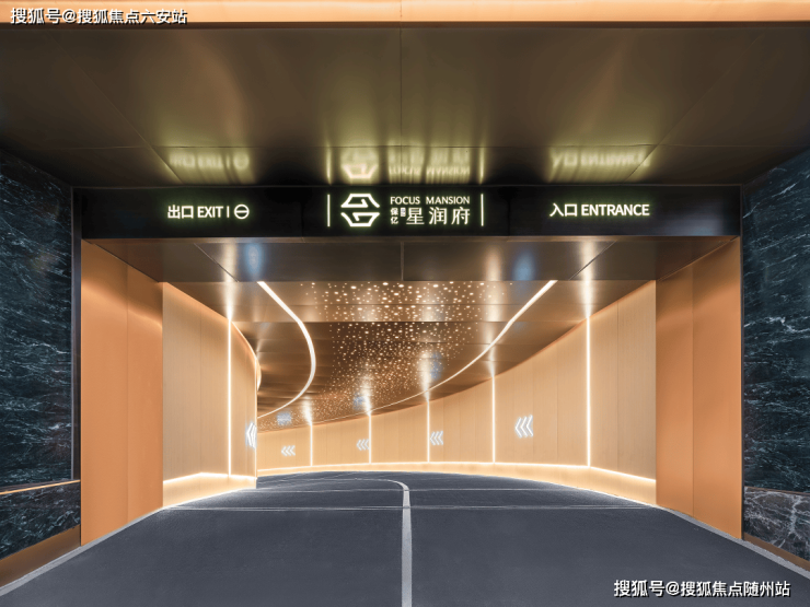 近80米的主入口用了大面积的「普拉达绿奢石」铺设,镶嵌的古铜色金属线条搭配嵌入式灯带映衬,彰显出大户人家门庭风范。