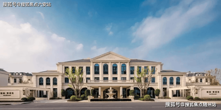 整个园区,以经典的绿城法式墅区景观大中轴贯穿,占地约1000多㎡,联排建筑的设计,融合了中国传统院落布局与法国枫丹白露宫的审美,外立面大面积采用全石材干挂,檐口等细节部位使用仿石。