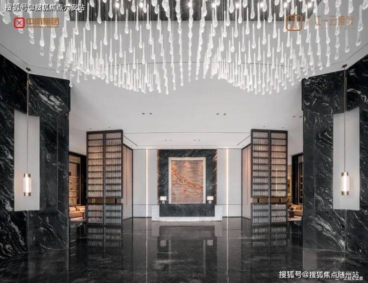 恢宏门庭顶序礼制,近6米高超五星级酒店式入户大堂,墙面甄选香格里拉酒店专用的黑荒料奢石,碧潭金沙的地面,背景墙以纯手工定制宋瓷官窑的手法打造独特的陶瓷挂画艺术品,营造出考究、厚重内敛的奢华感。