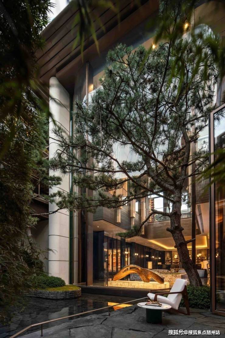 黑松迎宾,太行金石皮摹写山水肌理,开启松间画屏的宁静序章。斗拱、榫卯、拱门、丝织元素转译舒卷归堂的东方美学,穹顶之下,归家即享恢弘妙境。叠石、壑松、理水相映,约15米超尺叠瀑倾泻而下,以“银河叠水”奇观展现动态的《溪山行旅图》意境。下沉茶室静对流水,独拥“月映听泉”之幽。