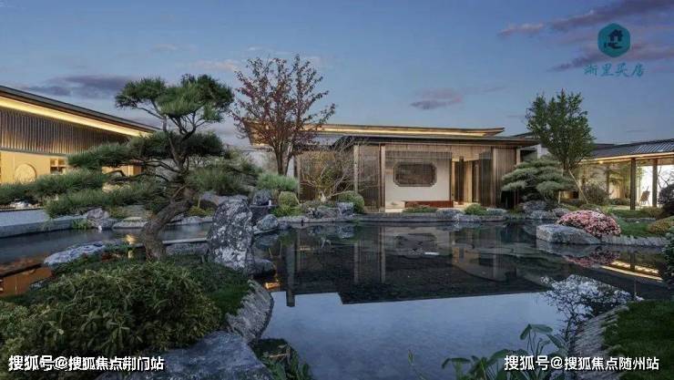 中式古典园林,以吴冠中的《双燕图》、宋徽宗的《瑞鹤图》等作品为意境,三进山水庭院,叠石理水,亭阁相望,仿佛来到了苏州名园。