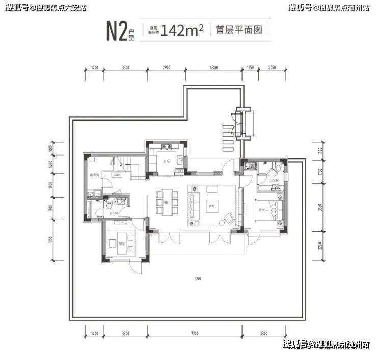 142㎡户型为例,面宽约15.2米,标准4房4卫。一楼是约7.2米长的双面采光大横厅,除了老人套房,还有个向院子伸出的“X空间”。