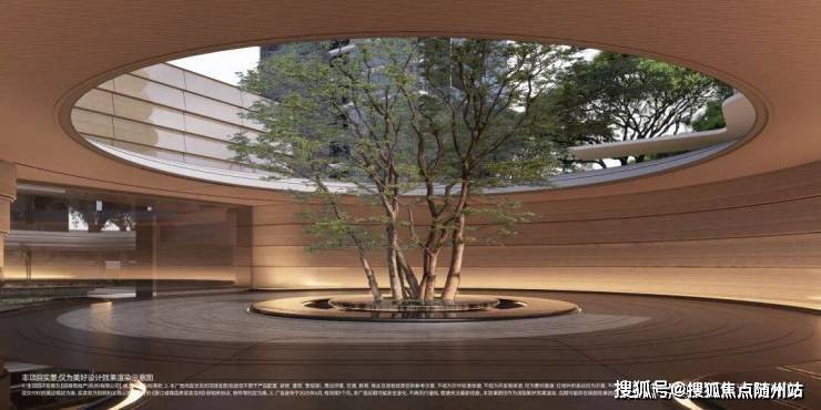 穿过沧浪华盖之后的第二重门厅“天光云廊”,环形的回廊中间,超过百年树龄、高约10米的乌桕,中心设计双悬浮水景装置,蓝翡翠石材与安哥拉黑石材搭配,圆形水盘通过循环水流,形成动态水幕,灵感来源于迪拜棕榈岛喷泉的悬浮效果。