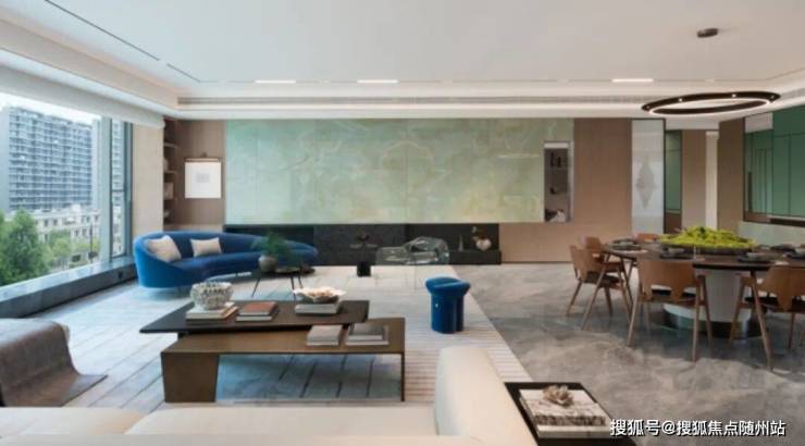 对于高净值客群来说,客餐厅需要「方圆双全」。建筑面积约365平米户型拥有宽约13米的大横厅,不仅可以放得下约10人座的大圆桌,又可以放得下长桌,形成与客厅对望的开放式书房。