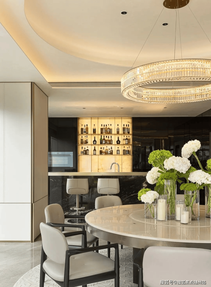 会客区以圆润吊顶拓宽视觉视野,漫射光线从弧形边缘倾泻而下,营造出亲和氛围。大理石与木饰面的经典搭配,将现代质感与沉稳气息融合。中央圆桌与沙发围合出的交流场域,既满足了社交需求,又保留了家庭空间的温暖属性。