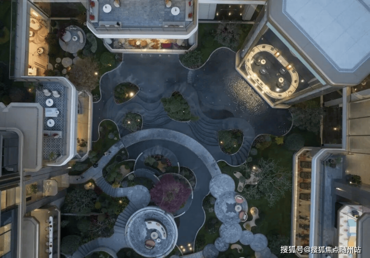 下沉式庭院示范区现已呈现的“高山流水”中芯景观,其超10米的高差寓意步步高升,庭院中层层叠叠的圆形铺装如玉盘叠翠,大小玉盘于林间穿梭,水幕、台地与悬浮廊架交相辉映,共同构筑出一幅既可赏玩又可徜徉的立体山水画卷,意境非凡、别具一格。