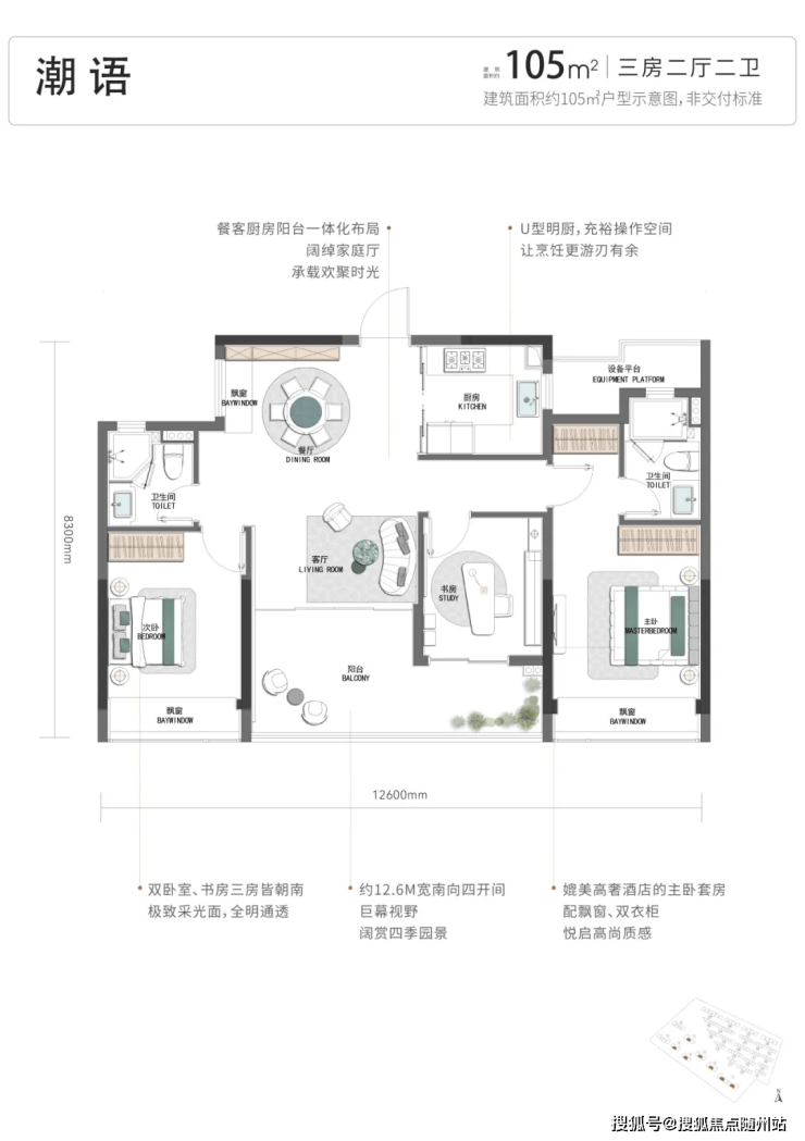 项目的户型起步就是四开间朝南的建面约105方三房: