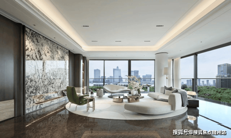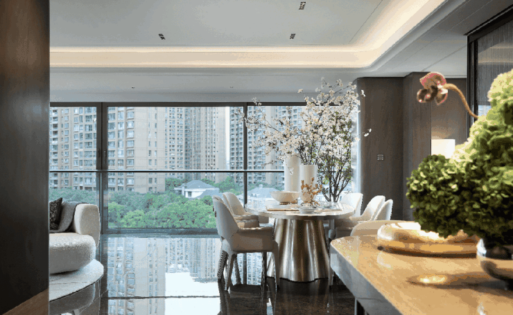 270°L型阳台的IMAX视野,是“独处与社交”的双重载体。创新的广角会客厅搭配270°L型全落地窗景阳台,将东部新城天际线与甬新河景“框”进室内。阳台进深约1.8米,足够摆放休闲茶座与绿植,凭栏远眺河景与城市繁华,享受“私享大片”的视觉体验。