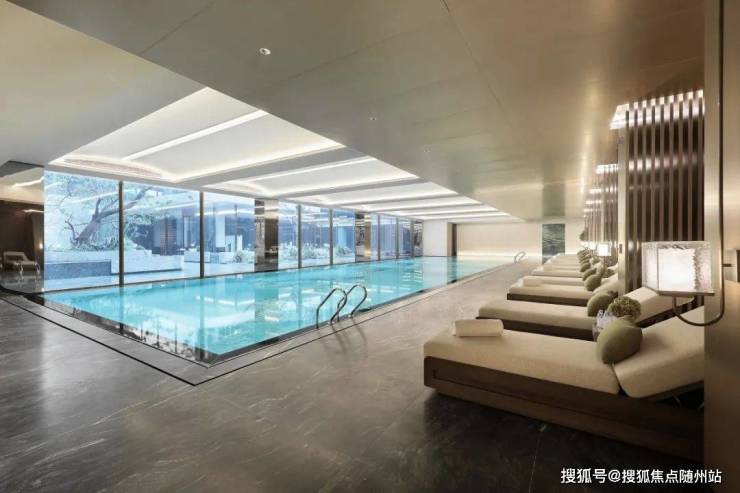 恒温泳池的池底,采用复杂的拼花马赛克工艺,在水面拼装出一朵绽放的浪花;碧玉琉璃般的水色,透过大面积玻璃幕墙与下沉水院的互相映照,漾开自在的微波。