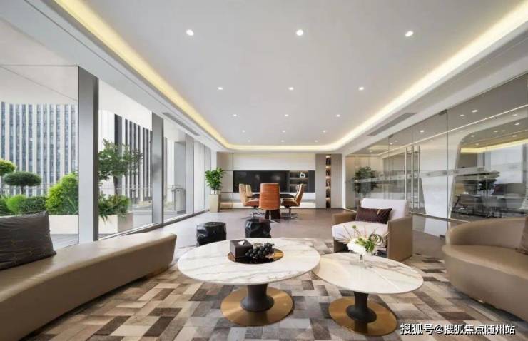洽谈区则以「游艇式海上会所」的调性打造,整面向外打开,形成超大环形景观面,旁边还配置高端水吧,绿植则选取了柳叶百合竹,整个空间随性自由,让人没有拘束感。