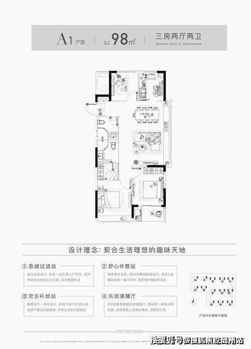 建面约89㎡:三室两厅两卫,全明设计,动静分区