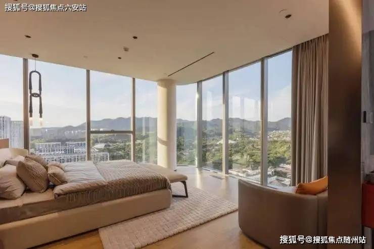 三面超白玻幕墙设计,270°环景视野,约17米巨幕面宽将四季山岚引入室内,70㎡无梁大板客厅与松涛声共鸣。- **复合功能**:首创“办公会客+宴会休憩”复合模式,东边套四房三卫双主卧,西边套四房四卫三朝南套房,空中酒廊与中西双厨满足商务与生活平衡。